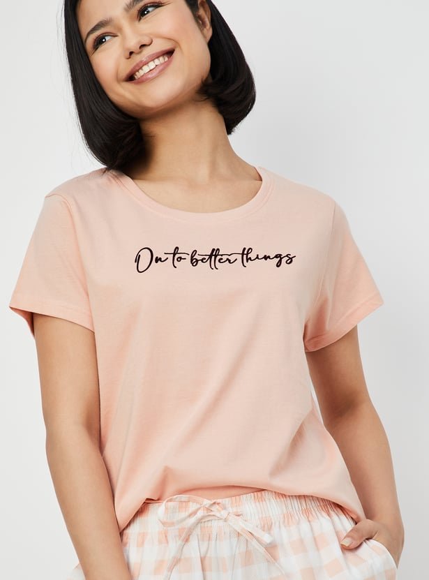 Relax in comfort and style with this sleepwear set. The knit t-shirt features a half sleeve design and a classic round neck, while the checked pyjamas offer a cozy fit with a drawstring closure and convenient side pockets. Model Size :